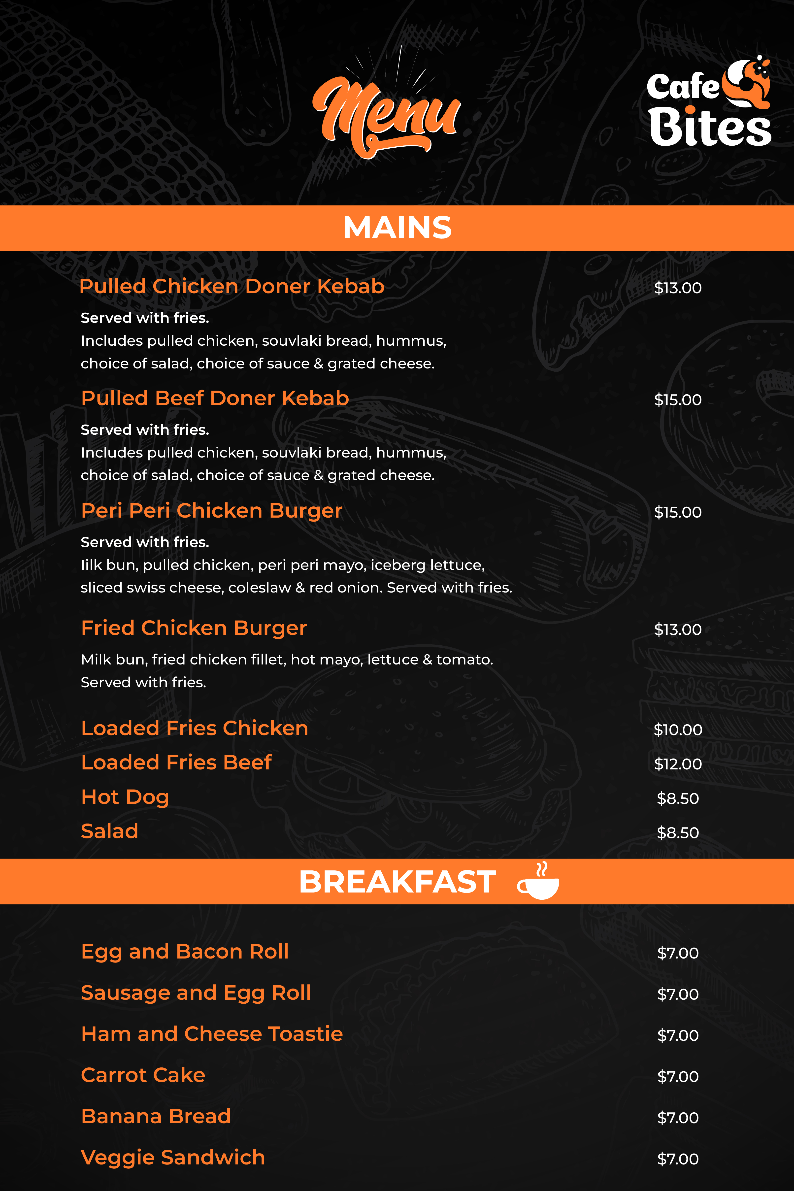 At Cafe Q Bites, we’re slinging stacked kebabs, spicy burgers, loaded fries, and brekkie rolls that actually hit. Not a meat-eater? We’ve got solid veg options too—like fresh veggie sandwiches, banana bread, and a seriously moist carrot cake.